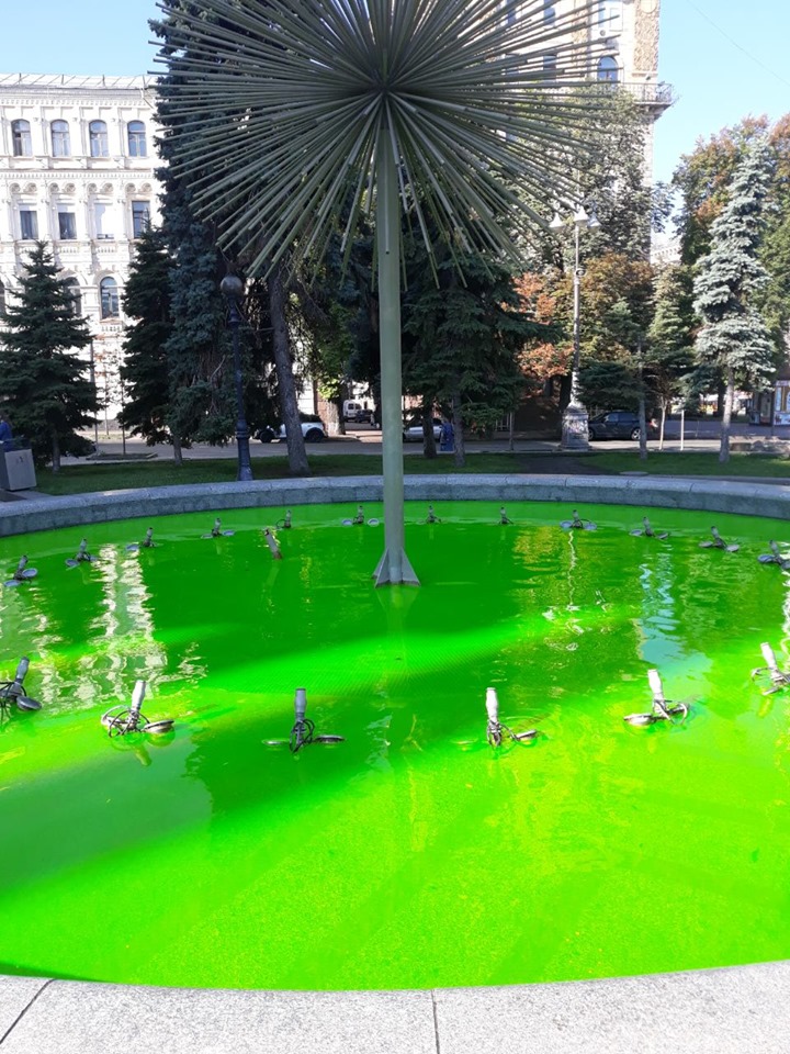 Вода одного из фонтанов на Майдане - Водяного шара, была окрашена в ярко-зеленую краску, а в чашу Малого - добавлен мыльный раствор.