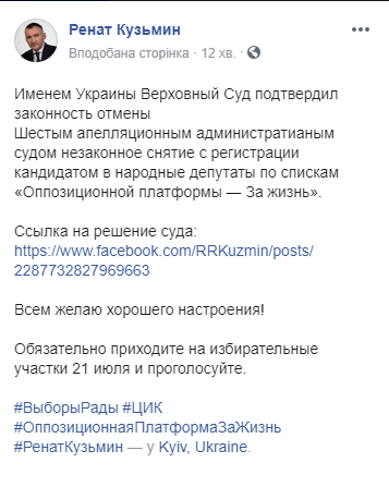 "Именем Украины Верховный Суд подтвердил законность отмены Шестым апелляционным административным судом незаконного снятия с регистрации кандидатом в народные депутаты по спискам "Оппозиционной платформы — За жизнь", - напиcал Ренат Кузьмин на своей странице в Facebook.