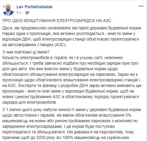 Министерство регионального развития предлагает изменить государственные строительные нормы (ГСН) и обязать новые и реконструированные АЗС обустраивать электрозарядные станции. Об этом на своей странице в Facebook сообщил заместитель министра регионального развития, строительства и жилищно-коммунального хозяйства Лев Парцхаладзе. Сейчас соответствующие изменения в ГСН находятся на рассмотрении.