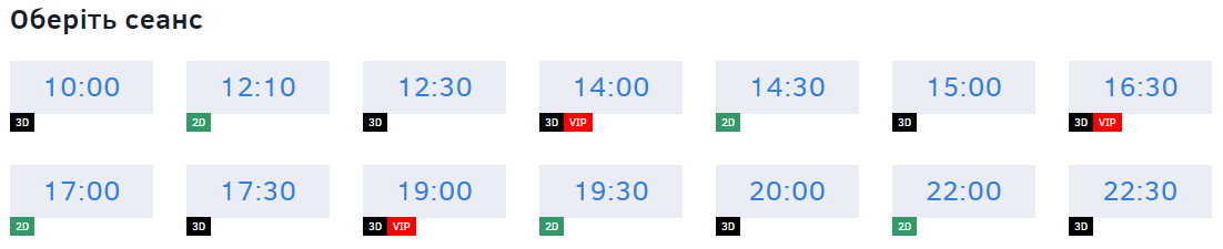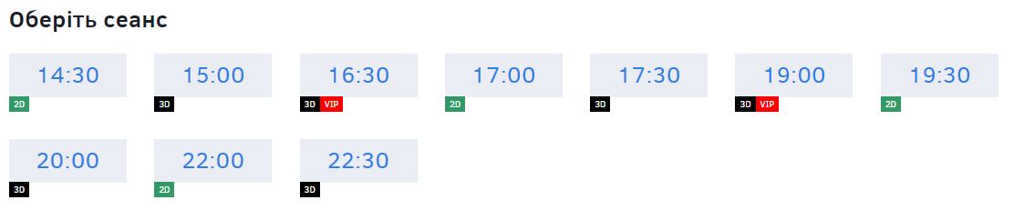 Начало сеансов - с 10:00, окончание - 22:30. Билеты Standard стартуют от 70-100 грн., VIP - 500 грн, сеансы с 19:30 - по 180 грн за билет.