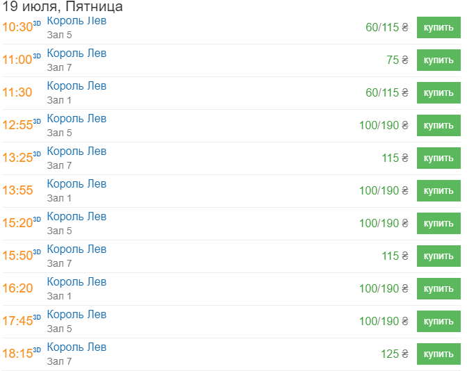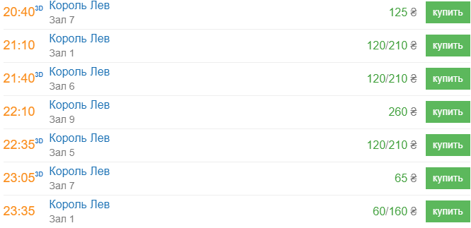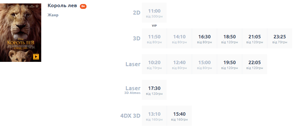 Начало показа в ТРЦ "Океан Плаза" в Киеве - в 11:00. Вип-зал обойдется в 500 грн за место. С 11:50 до 16:30 билеты 3D будут стоить от 80 грн. В 18:50 и 21:05 посмотреть "Король Лев" можно будет за 120 грн. В 23:25 - билеты значительно подешевеют и будут стоить около 70 грн. При этом билеты типа Laser стоят от 70 до 120 грн в вечернее время.