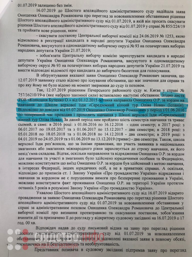 "12 июля 2019 года решением Печерского районного суда г.Киева в деле №757/36210/19-а (вступившем в законную силу) установлены следующие обстоятельства: Согласно письму ООО "Конюшня Бутенко" от 1.12.2015, последняя направила Онищенко за границу для обучения в школе верховой езды "Средиземный конный тур Олива Нова" (Испания). В соответствии со справкой от 5.07.2019, Онищенко Александр Романович в период с 1.06.2016 по настоящее время проходил и проходит обучение в школе верховой езды "Средиземный конный тур Олива Нова". За данный период он прошел шесть семестром обучения и продолжает седьмой", - говорится в решении Шестого апелляционного админсуда.
