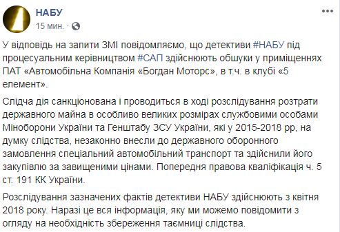 Сотрудники Национального антикоррупционного бюро (НАБУ) и Специализированной антикоррупционной прокуратуры (САП) проводят обыски в помещениях "Богдан моторс", включая спортклуб "5 элемент", по делу о закупках чиновниками Минобороны и Генштаба авто по завышенным ценам. Об этом сообщает пресс-служба НАБУ на своей странице в Facebook.