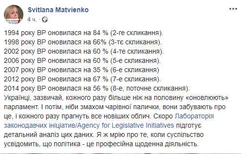 Во время выборов в парламент украинские избиратели, как правило, каждый раз более чем на половину "обновляют" Верховную Раду. Об этом сообщила председатель совета Лаборатории законодательных инициатив Светлана Матвиенко на своей странице в Facebook.