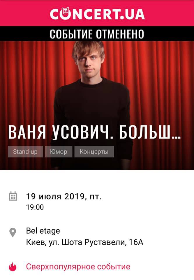 "Организатор сообщает, что стенпад Вани Усовича 19.07.2019 и 19.07.2019, к сожалению, отменен. Артиста не пропустили на границе", говорится в сообщении.