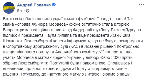 "Дело Мораеса окончательно стало историей. Вчера получил официальное письмо от Федерации футбола Люксембурга, подписанное президентом Полем Филиппом и вице-президентом Жан-Жаком Шонкертом. Люксембургские коллеги не будут оспаривать в Спортивном арбитражном суде решение контрольно-дисциплинарного и апелляционного комитета УЕФА по поводу участия Жуниора Мораеса в матчах сборной Украины квалификации Евро-2020", - написал Андрей Павелко.