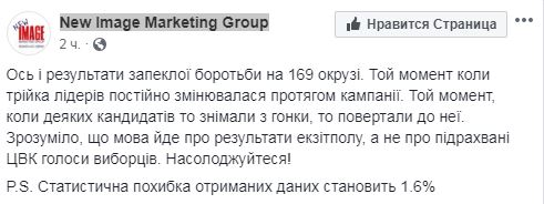 "Вот и результаты заядлой борьбы на 169-м округе. Тот момент когда тройка лидеров постоянно менялась на протяжении кампании. Тот момент, когда некоторых кандидатов то снимали с гонки, то возвращали в нее. Понятное дело, речь идет о результатах экзитпола, а не о подсчитанных ЦИК голосах избирателей. Наслаждайтесь!", - сказано в сообщении.