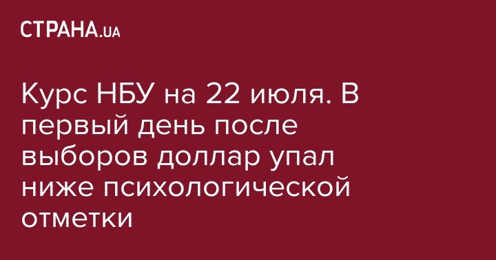 Национальный банк Украины на первый день после досрочных выборов в Раду, 22 июля, установил официальный курс 25,815345 гривен за доллар США. Данные по курсам валют обновлены на официальном сайте НБУ.