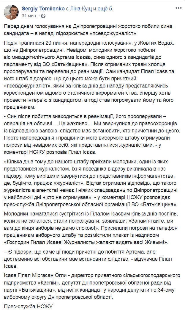 Позавчера, 20 июля, накануне выборов, в Желтых Водах был жестоко избит сын кандидата в депутаты от ВО "Батькивщина" Гилал Исаев. Как сообщает в своем Facebook руководитель Национального союза журналистов Украины Сергей Томиленко, в нападении подозревают "псевдожурналиста".