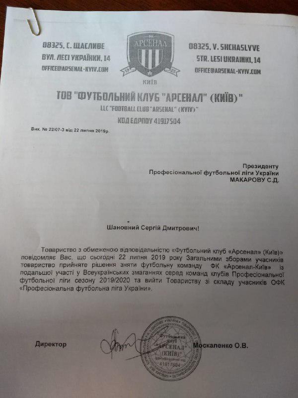 ФК "Арсенал-Киев" не будет играть в Первой лиге в новом сезоне чемпионата Украины по футболу. Руководство столичного клуба сообщило об этом решении президенту ПФЛ Сергею Макарову в официальном заявлении, передает Sport Arena.