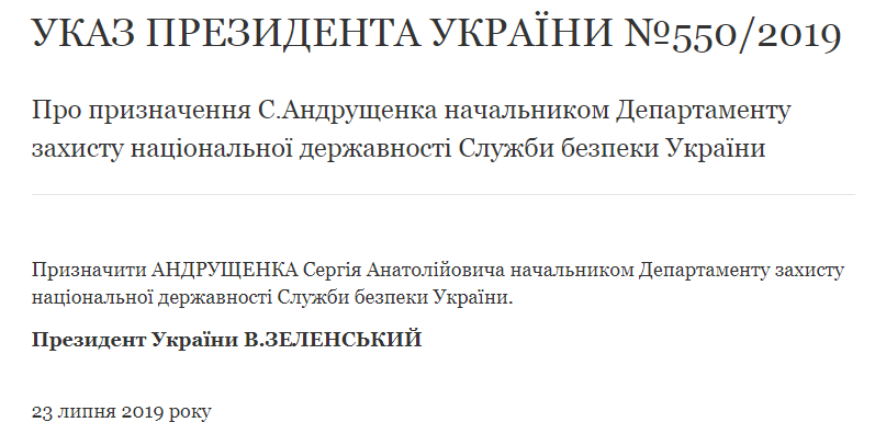 "Назначить Андрущенко Сергея Анатольевича начальником Департамента защиты национальной государственности Службы безопасности Украины", - говорится в документе.