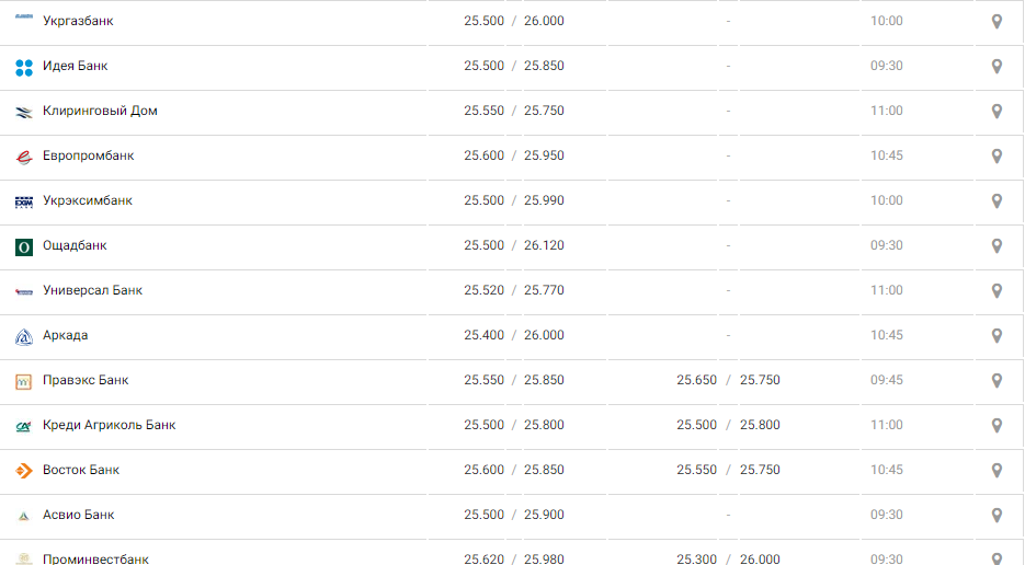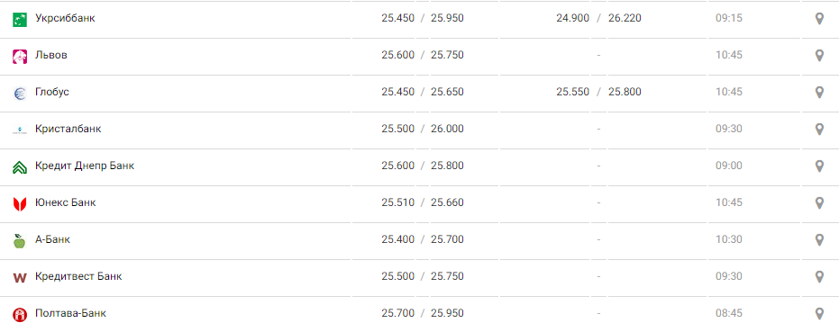 В банках курс доллара к 11:00 находится в коридоре 25,4-25,6 грн - покупка и 25,69-25,95 - продажа - в зависимости от разных банков. К этому времени банки выставили такие курсы в кассах: Приватбанк - 25.550/25.950, Райффайзен Банк Аваль - 25.400/25.850, Укрсоцбанк - 25.450/25.800, Альфа-Банк - 25.550/25.950, Пумб - 25.500/25.900, Ощадбанк - 25.500/26.120, Укргазбанк - 25.500/26.000, Укрэксимбанк - 25.500/25.990, ОТР банк - 25.450/25.690, Укрсиббанк - 25.450/25.950, А-банк - 25.400/25.700.