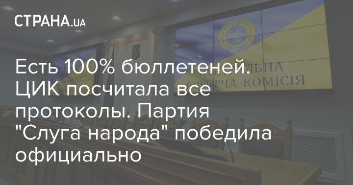 ЦИК подсчитала 100% голосов. На первом месте - "Слуга народа", у партии 43,16%. Второе место заняла "Оппоплатформа-За Жизнь" с 13,05%. "Батькивщина" занимает третье место (8,18%), обойдя в процессе подсчета "Европейскую солидарность" (четвертое место и 8,10%). Замыкает пятерку проходных политсил "Голос", у него 5,82%. Остальные партии не набрали более 5%, что было необходимым условием для прохождения в Верховную Раду.