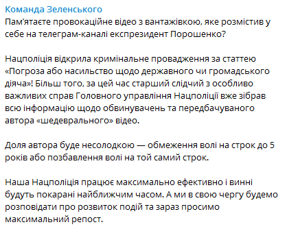 Нацполиция открыла уголовное производство по факту распространения видеоролика еще 11 апреля - с квалификцией по стч. 2 ст. 346 УК Украины - угроза или насилие в отношении государственного или общественного деятеля. Правоохранители сообщили, что открыли дело после мониторинга соцсетей, то есть не по обращению со стороны представителей Владимира Зеленского.