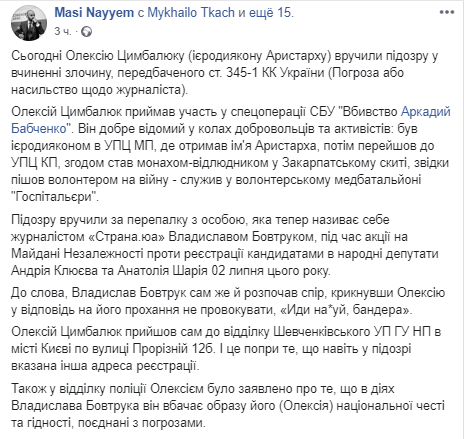 Уточним, что полиция готовится объявить подозрение Алексею Цымбалюку по статье 345-1 Криминального кодекса Украины. Первая часть этой статьи предусматривает максимальное наказание лишением свободы на срок до трех лет: "1. Угроза убийством, насилием или уничтожением или повреждением имущества в отношении журналиста, его близких родственников или членов семьи в связи с осуществлением этим журналистом законной профессиональной деятельности наказывается исправительными работами на срок до двух лет или арестом на срок до шести месяцев, или ограничением свободы на срок до трех лет, или лишением свободы на срок до трех лет".