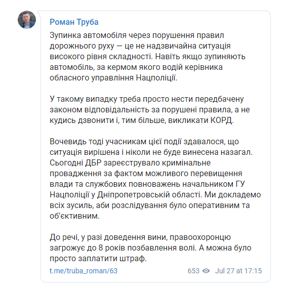 Роман Труба в телеграм заявил, что сегодня ГБР зарегистрировало уголовное производство по факту возможного превышения власти и служебных полномочий начальником ГУ Нацполиции в Днепропетровской области.