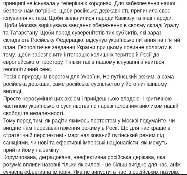 "На самом деле взгляд на действительность Навального более опасен для нас, чем взгляд Путина. Потому что Украине нужно, чтобы российское государство в принципе не существовало в нынешних границах...Чтобы освободились народы Кавказа и другие народы... Геополитическая задача Украины при этом должна заключаться в том, чтобы обеспечить интеграцию бывших территорий России в европейское пространство...