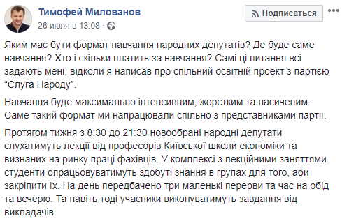 "В течение недели с 8:30 до 21:30 новоизбранные народные депутаты будут слушать лекции от профессоров Киевской школы экономики и признанных на рынке труда специалистов. В комплексе с лекционными занятиями студенты будут обрабатывать полученные знания в группах для того, чтобы закрепить их. В день предусмотрено три маленьких перерыва и время на обед и ужин. И даже тогда участники будут выполнять задания от преподавателей", – написал он.