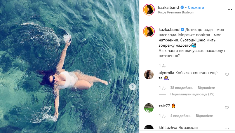 Вокалистка популярной украинской группы KAZKA Александра Зарицкая показала в соцсети морские фото, сделанные во время отдыха в Турции. Снимки опубликованы на странице группы в Instagram. На ярких фото можно рассмотреть, как Александра в белом купальнике плавает в прозрачной морской воде. При этом закрытый купальный костюм подчеркивает пышные формы певицы.