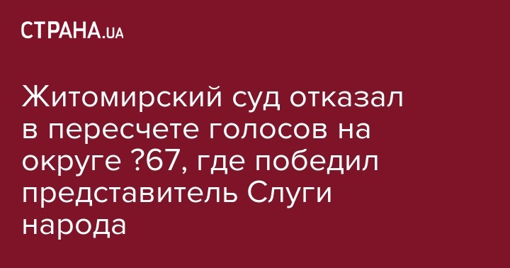 Житомирский окружной административный суд отказал в иске по осуществлению пересчета голосов в одномандатном избирательном округе № 67. Об этом сообщает Гражданская сеть Опора.