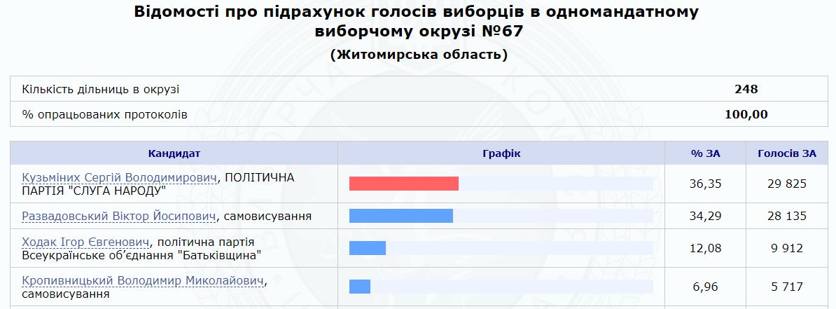 "Народный депутат и кандидат в нардепы по одномандатному избирательному округу № 67 (г. Чуднов) Виктор Развадовский подал иск в суд с просьбой признать противоправными действия окружной избирательной комиссии и обязать ее осуществить пересчет голосов на всех участках округа. 27 июля Житомирский окружной административный суд в удовлетворении иска отказал", - говорится в сообщении.