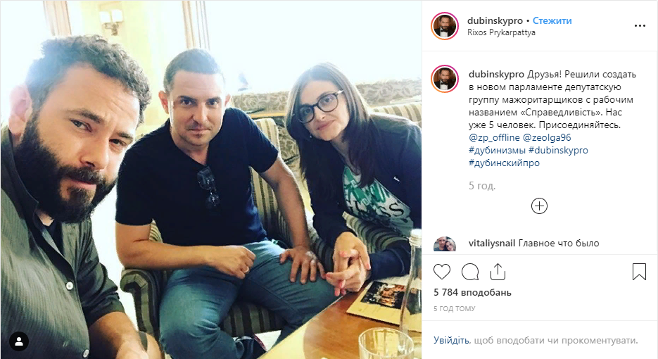 "Друзья! Решили создать в новом парламенте депутатскую группу мажоритарщиков с рабочим названием "Справедливість". Нас уже 5 человек. Присоединяйтесь", - говорится в сообщении. К нему прикреплено фото, на котором Дубинский находится вместе с двумя другими депутатами, избранными по мажоритарным округам от "Слуги народа" - Кунницким и Василевской-Смаглюк.
