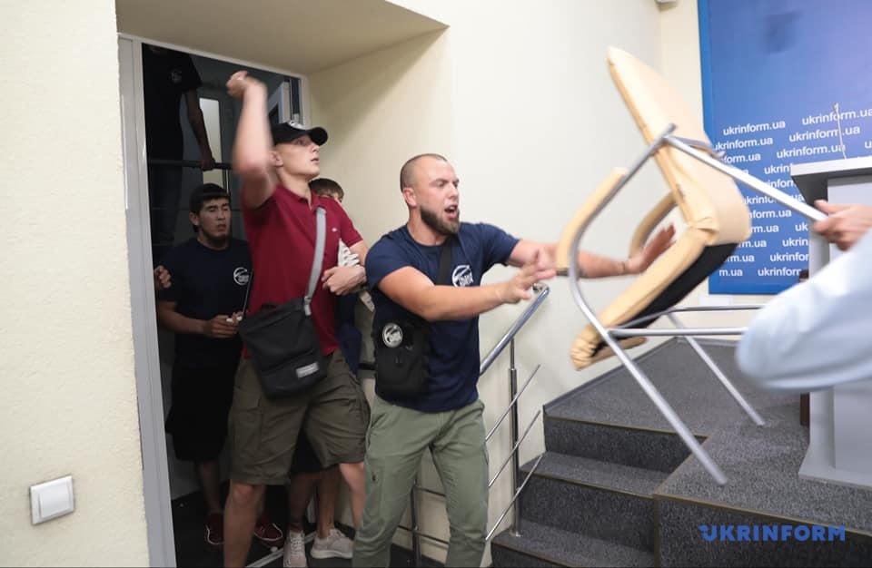 В агентстве Укринформ закрыли свой первый пресс-зал, после того, как на него напали молодчики в футболках "Традиция и порядок", повредив оборудование.