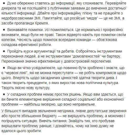 И.о. министра здравоохранения Ульяна Супрун советует нардепам не позволять манипулировать собой, всегда проверять факты, учиться слушать и признавать свои ошибки. Об этом она написала в Facebook.