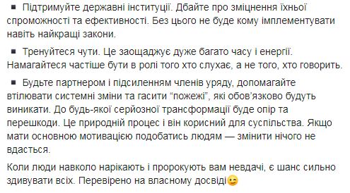 Также она советует поддерживать государственные институты, учиться слышать собеседника, быть партнерами для членов правительства, помогать воплощать системные изменения и тушить "пожары", которые "обязательно будут возникать".