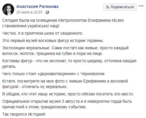 Она отмечает, что помещение музея освятил глава ПЦУ Епифаний, восковой двойник которого также есть в музее. "...Посмотрите на мое фото с живым Епифанием и восковой фигурой - отличить ну нереально", - пишет журналистка и отмечает высокое качество кукол.
