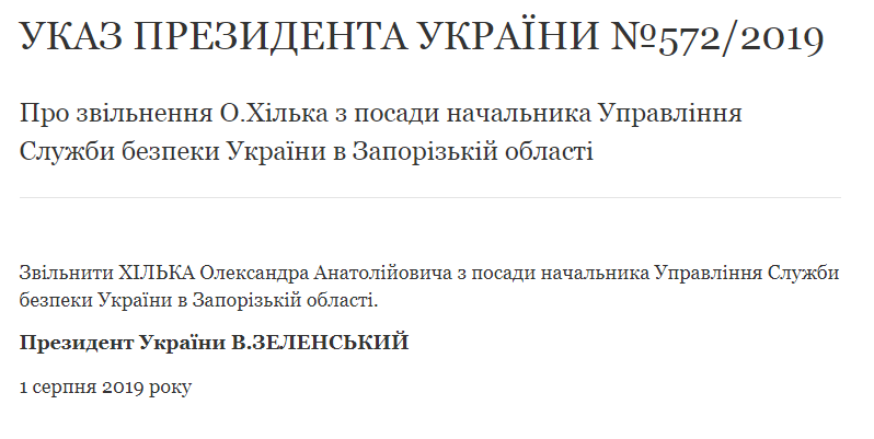 "Уволить Хилько Александра Анатольевича с должности начальника Управления Службы безопасности Украины в Запорожской области", - говорится в указе №572/2019.