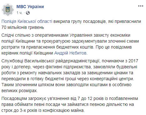 Следователи полиции совместно с прокуратурой разоблачили чиновников Васильковской райгосадминистрации Киевской области, которые присвоили 70 млн гривен бюджетных средств. Об этом сообщил руководитель полиции Киевской области Андрей Небытов, передает пресс-служба МВД Украины в Facebook.