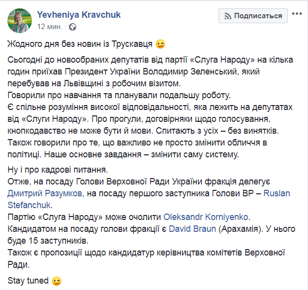 "Итак, на должность председателя Верховной Рады Украины фракция делегирует Дмитрия Разумкова, на должность первого заместителя председателя ВР - Руслана Стефанчука. Партию "Слуга народа" может возглавить Александр Корниенко. Кандидатом на должность председателя фракции является Давид Арахамия. У него будет 15 заместителей", - написала спикер.