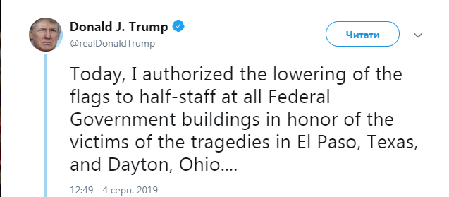"Сегодня я распорядился приспустить флаги на всех зданиях федерального правительства в память о жертвах трагедий в Эль-Пасо, штат Техас, и в Дейтоне, штат Огайо. Флаги в Белом доме будут опущены с сегодняшнего дня до четверга, 8 августа. Мы с Меланией молимся за всех, кто пострадал от этого невероятного зла", - написал лидер США.
