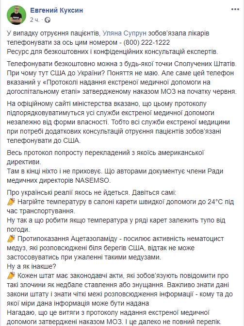 "Ресурс для бесплатных и конфиденциальных консультаций экспертов. Звонить бесплатно можно из любой точки Соединенных Штатов. При чем здесь США к Украине? Понятия не имею. Но именно этот телефон указан в "Протоколе оказания экстренной медицинской помощи на догоспитальном этапе" утвержденном приказом МИНЗДРАВА в начале июня", - говорится в сообщении.