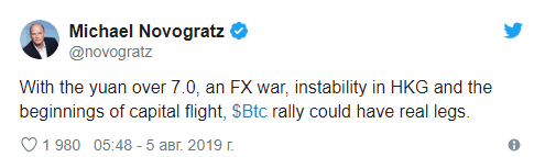 Биткоин резко вырос в тот момент, когда китайская валюта подешевела сразу на 7%, достигнув 11-летнего минимума. За китайский юань дают $7. Это произошло после того, как торговая война с США вышла на новый виток.