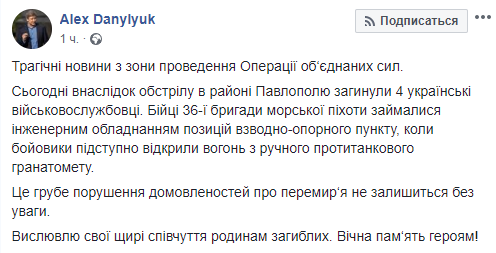"Сегодня в результате обстрела в районе Павлополь погибли 4 украинских военнослужащих. Бойцы 36-й бригады морской пехоты занимались инженерным оборудованием позиций взводный-опорного пункта, когда боевики коварно открыли огонь из ручного противотанкового гранатомета. Это грубое нарушение договоренностей о перемирии не останется без внимания", - написал в соцсети Данилюк.