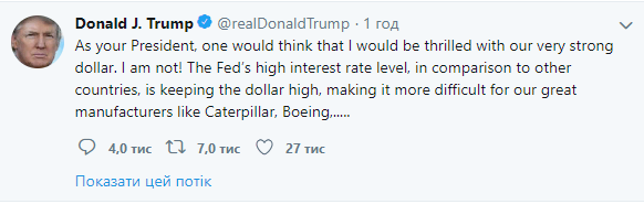 "Как ваш президент, можно подумать, что я был бы рад нашему очень сильному доллару. Но я не рад!", - написал Трамп в Твиттере.