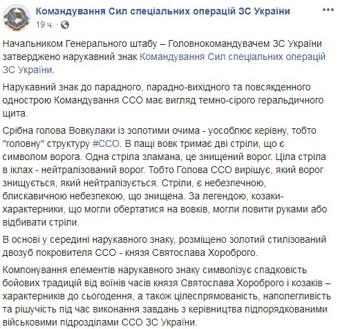 Отмечается, что нарукавный знак парадного, парадно-выходного и повседневного обмундирования Командование ССО имеет вид темно-серого геральдического щита. "Серебряная голова Оборотня с золотыми глазами - олицетворяет руководящую, то есть "главную" структуру ССО. В пасти волк держит две стрелы, что является символом врага. Одна стрела сломана, это уничтоженный враг. Целая стрела в клыках - нейтрализованный враг. То есть Голова ССО решает, какой враг уничтожается, который нейтрализуется. Стрелы, является опасной, молниеносной опасностью, уничтожена. По легенде, казаки-характерники, которые могли превращаться в волков, могли ловить руками или отбивать стрелы", - пишет пресс-служба.