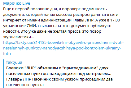 Отметим, что ранее по украинским СМИ прошел скрин якобы "указа" главы т.н. "ЛНР" Леонида Пасечника, которым он поручил включить Станицу Луганскую в состав территории "республики".
