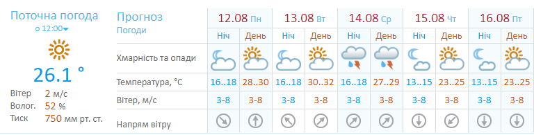 Прогноз Мeteoprog.ua показывает, что в понедельник и вторник воздух прогреется до +29...+32. 13 августа возможна гроза. В среду, 14 августа, температура днем опустится до +22, обещают грозу. Погодный ресурс обещает дождь и в пятницу, 16 августа. Погода на выходных такая: днем +25...+26, переменная облачность без осадков.