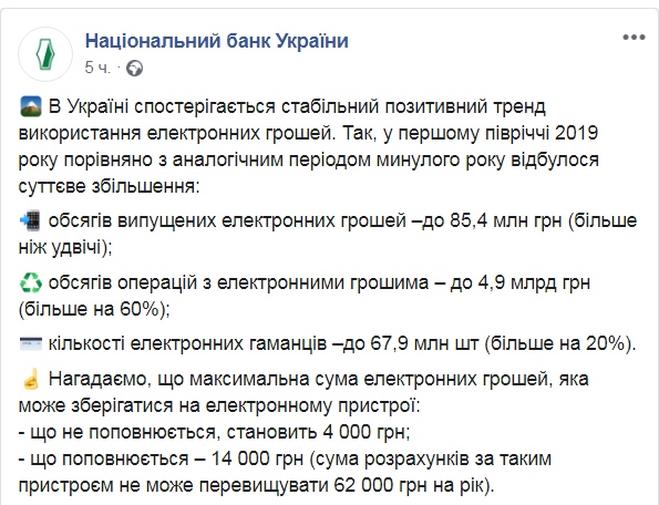 Если за весь 2018 год было выпущено 83,2 млн грн. электронных денег, то в этом году всего за шесть месяцев объем выпуска достиг 85,4 млн грн.