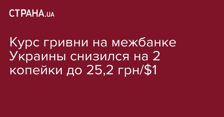 Курс гривни на межбанковском валютном рынке в понедельник снизился почти на 2 копейки до 25,205 грн/$1 с 25,19 грн/$1 в предыдущий рабочий день. Об этом сообщили агентству Интерфакс-Украина дилеры коммерческих банков.