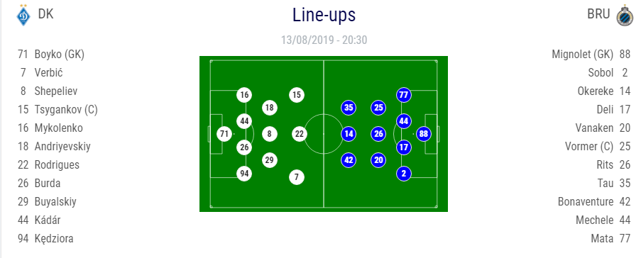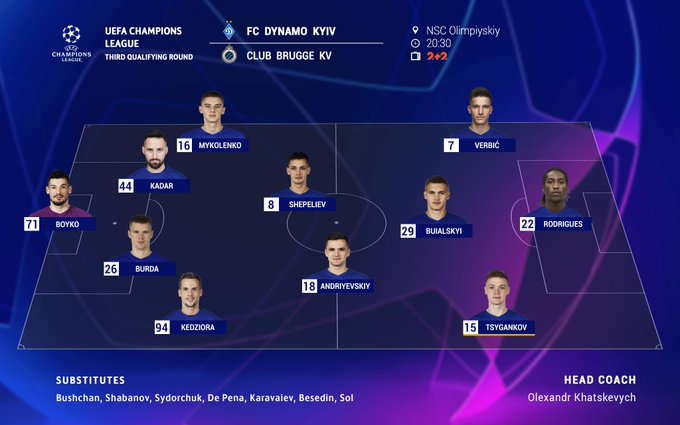 20:08 Игроки Динамо выйдут на поле НСК Олимпийский в белой форме (Денис Бойко - в форме салатового цвета), гости из Брюгге - в своей традиционной черно-синей форме (вратарь "Брюгге" Симон Миньоле - в красной).