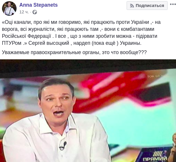 "Эти каналы, о которых мы говорим, которые работают против Украины - на врага, все журналисты, которые работают там, - они являются комбатантами Российской Федерации. И все, что с ними можно сделать - подорвать ПТУРом, то есть закрыть" - заявил нардеп в эфире ток-шоу "Прямой эфир" от 12 августа. Речь шла про каналы "NewsOne" и "112".