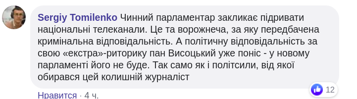 Коллегу поддержал Сергей Томиленко - председатель Национального союза журналистов Украины. В комментариях к посту он написал: "Это вражда, за которую предусмотрена уголовная ответственность. А политическую ответственность за свою "экстра"-риторику господин Высоцкий уже понес - в новом парламенте его не будет. Так же как и политсилы, от которой избирался этот бывший журналист".