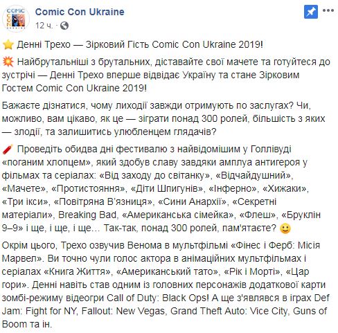 Знаменитый актер боевиков Дэнни Трехо, который запоминается своим харизматичным внешним видом, станет специальным гостем Comic Con Украина-2019. Об этом организаторы фестиваля сообщили в Facebook.