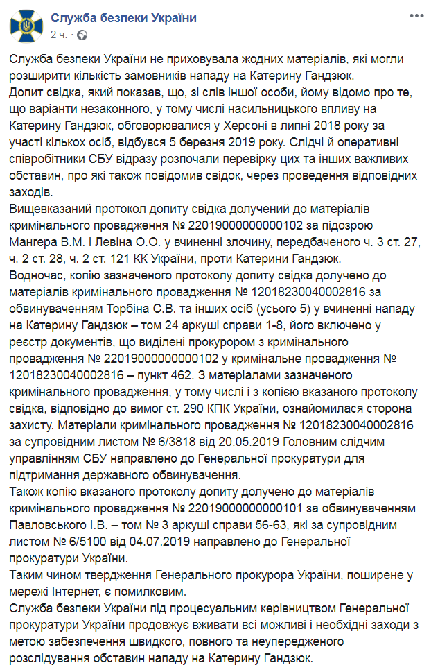 15 августа в интервью "Цензор.НЕТ" Луценко сказал, что СБУ скрыла материалы допросов, которые могли расширить количество заказчиков нападения на Гандзюк. В Службе безопасности заверили, что это заявление не соответствует действительности.