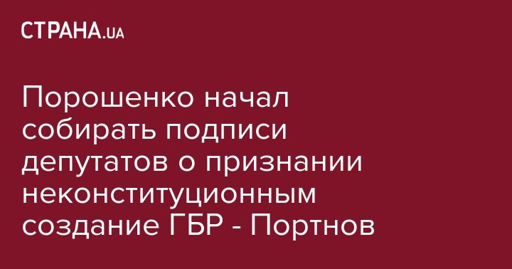 Экс-президент Украины Петр Порошенко начал собирать подписи уходящих депутатов из БПП под конституционным представлением, в котором он хочет признать неконституционным закон о Государственном бюро расследований, так как по Конституции президент не имеет полномочий назначить главу ГБР. Об этом на телеграме рассказала юрист Андрей Портнов.
