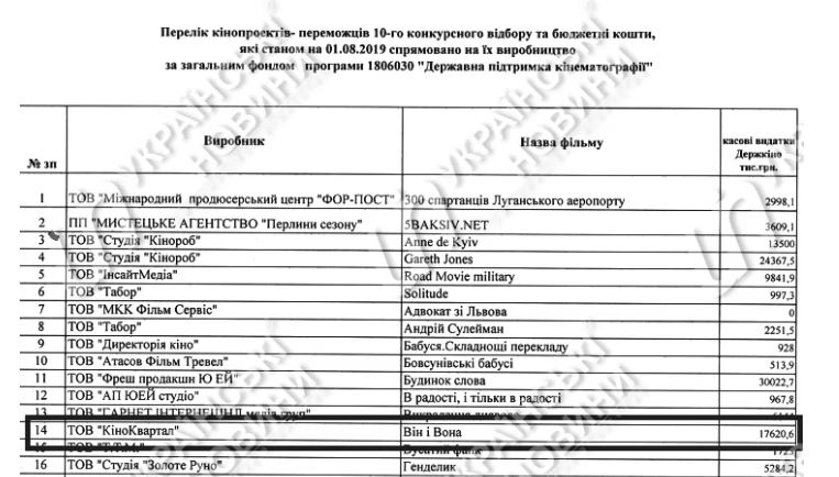Фильм "Он и Она" ООО объединения "Кино Квартал" в 2017 году, как один из участников 10-го конкурсного отбора Госкино, получил государственную поддержку из госбюджета, однако по результатам проката смог вернуть сумму на 4 млн грн меньшую от полученной, пишут Украинские новости.
